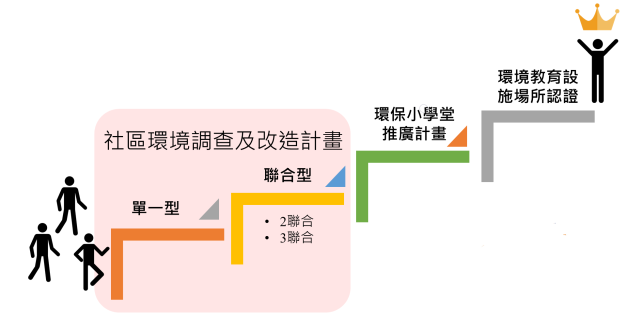 「環保小學堂」更強調的是環境教育的推動與落實,將環境教育的理念深植於社區志工與居民,搭配社區在地優質多元的環境教育學習場所,吸引外部學習者至社區,進行豐富且具有在地環境特色的導覽解說、體驗遊程與環境教育教案,凝聚社區居民的認同感,同時提升居民及外部學習者的環境素養,並進一步發展成為在地環境教育產業、活絡社區經濟。